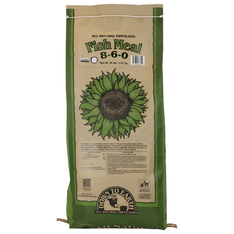 FISH MEAL 50 LB DOWN TO EARTH, Down To Earth’s Fish Meal 8-6-0 is recommended for vegetable gardens, flower beds and all types of outdoor plants, trees and shrubs. DTE Fish Meal 8-6-0 stimulates soil microbial life, promotes vigorous root development and provides an early season boost for all your plants.