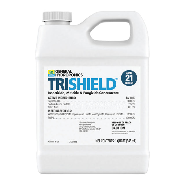 General Hydroponics TriShield Insecticide, Miticide & Fungicide Concentrate combines an unprecedented combination of three active ingredients to control or cure insects, mites and powdery mildew*