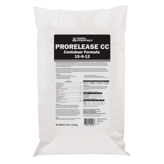 Desingned for Cooler Climates (CC) the General Hydroponics ProRelease Container Fertilizers are 100% coated granulated fertilizers. Designed for high value crops like cannabis, hemp and other aromatherapeutic herbs grown in containers, raised beds or fabric grow pots. Incorporate or apply at transplant and watch your crops thrive. Feeds for up to 4 months*. *will vary based on soil needs, planting density, climate, crop, media, irrigation or rainfall amount and especially other nutrient usages.*