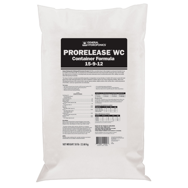 Desingned for Warmer Climates (WC) the General Hydroponics ProRelease Container Fertilizers are 100% coated granulated fertilizers. Designed for high value crops like cannabis, hemp and other aromatherapeutic herbs grown in containers, raised beds or fabric grow pots. Incorporate or apply at transplant and watch your crops thrive. Feeds for up to 4 months*. *will vary based on soil needs, planting density, climate, crop, media, irrigation or rainfall amount and especially other nutrient usages.*
