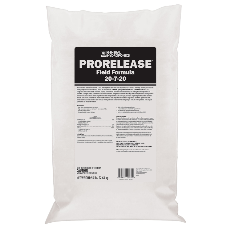 General Hydroponics ProRelease Field Formula 20-7-20 is a blend of coated and uncoated granulated fertilizers designed for high value field grown crops like hemp and other aromatherapeutic herbs. Apply at the start of your season and watch your crops thrive. Feeds for up to 4 months*. *will vary based on soil needs, planting density, climate, crop, media, irrigation or rainfall amount and especially other nutrient usages.