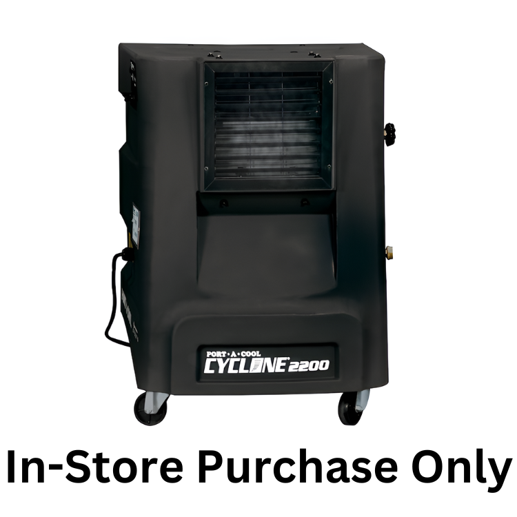 CYCLONE 2200 PORT A COOL, Huge in performance, this easy-to-operate evaporative cooler produces cool air where ever it is needed. This cooler can easily be transported and used in your home's backyard patios, garages, warehouses, workshops and factories during the hot summer months or whenever cooling is needed. With its compact size, the Portacool cyclone 2200 portable evaporative cooler is perfect for smaller settings, yet still delivers an impressive amount of air output. Enjoy your outdoor space longer, even when it is hot.