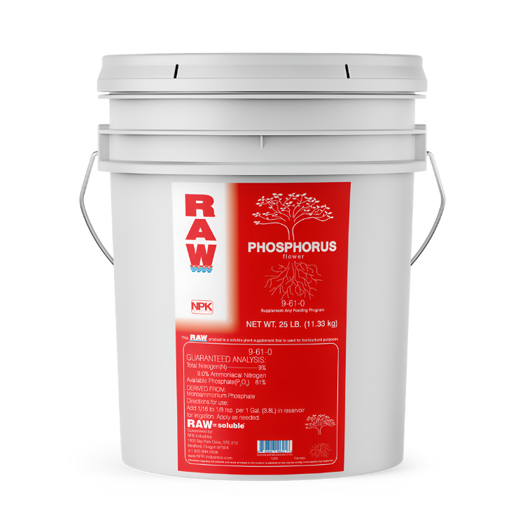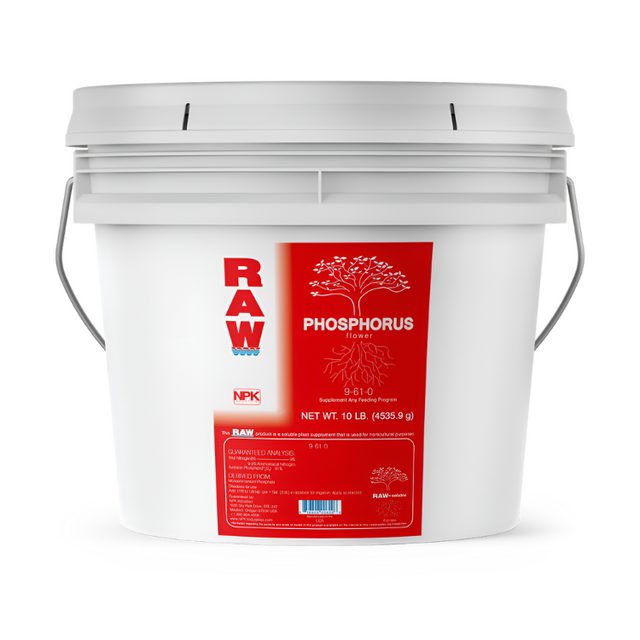 RAW Phosphorus contains 61% pure water Soluble Phosphate (P). This product also contains a small amount of Ammonium Nitrogen (9%) which plants can utilize during bloom. Phosphorus is particularly beneficial during the early rooting stage but also provides energy during fruit and flower production. RAW Phosphorus is ideal for boosting Phosphorus (P) levels, treating deficiencies and creating optimal recipe solutions. Works in conjunction with all nutrient and feeding programs.