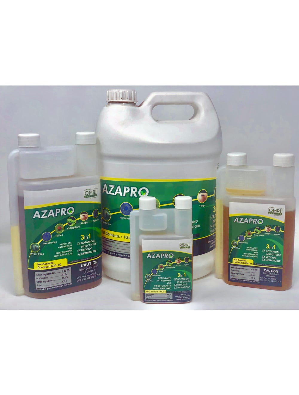 Azapro is a repellant extracted from neem tree seeds and works against mites, nematodes, caterpillars and other harmful garden pests. Use on any food or non-food crop up to day of harvest.