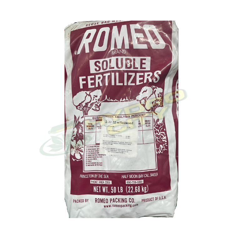ROMEO 2-32-32 Soluble Fertilizer with Seaweed Bloom Base is designed to enhance your plant's blooming potential with a high phosphorus and potassium content (2-32-32 NPK ratio). Enriched with natural seaweed extracts, this fertilizer improves nutrient uptake, soil health, and plant resilience. Its water-soluble formula allows for efficient application and rapid nutrient availability. Suitable for a variety of plants, including flowers, vegetables, and fruit-bearing plants, ROMEO 2-32-32 is ideal for both soil and hydroponic systems. Available in a 50 LB bag, it is economical and convenient for large gardens and commercial operations.